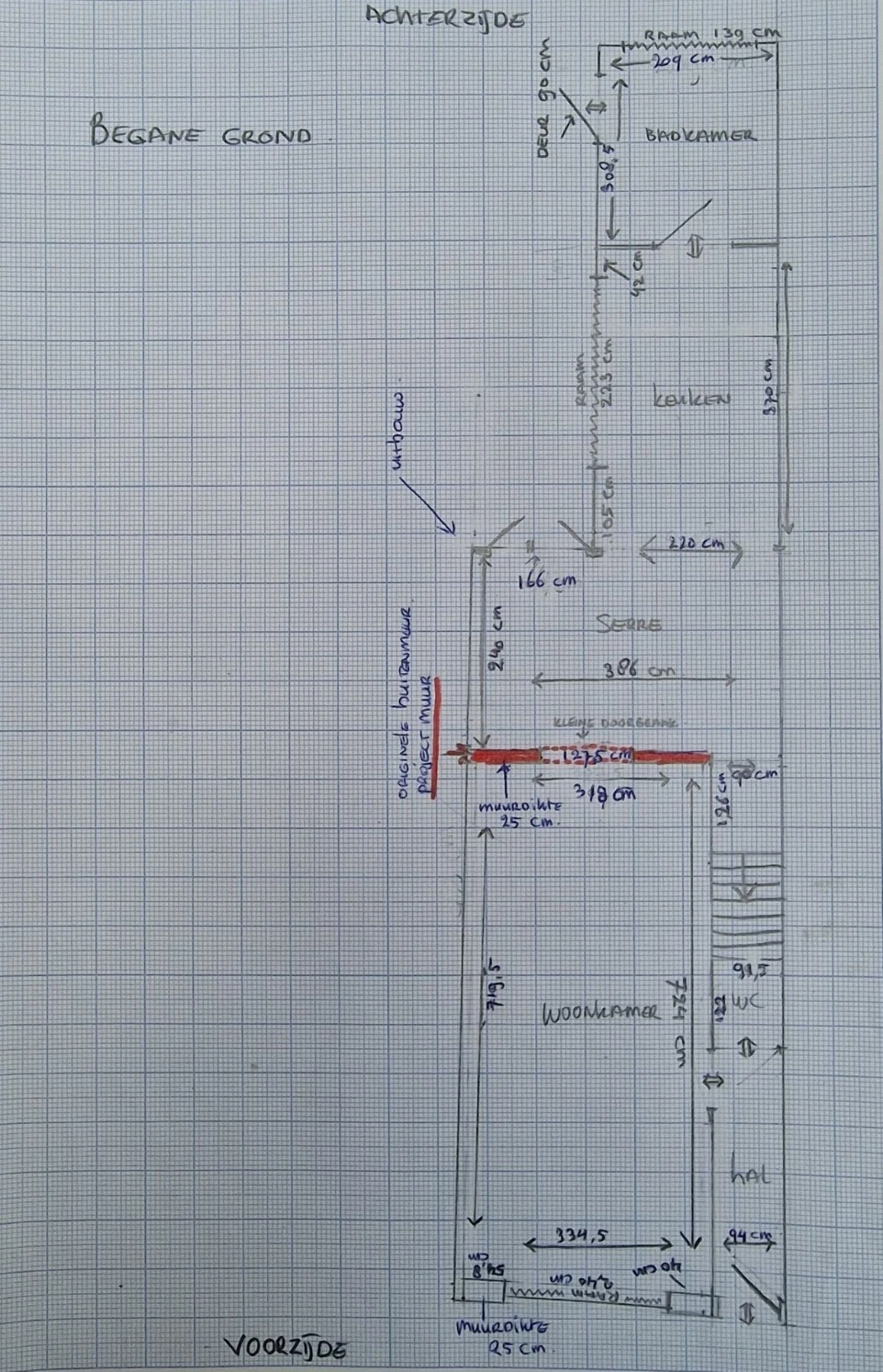 - Begin met de plattegrond van de begane grond van de woning, zie voorbeeld foto hierboven. schets de plattegrond en schrijf daarna alle maten op en omschrijf per ruimte de functie